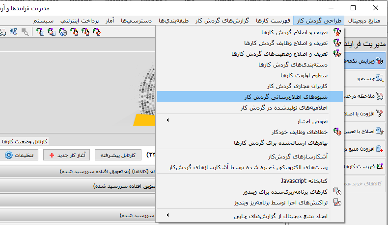 گام اول برای اطلاع رسانی تعریف شیوه اطلاع رسانی است. برای این کار باید مطابق شکل زیر از منوی «طراحی گردش کار» روی گزینه «شیوه های اطلاع رسانی گردش کار» کلیک کنید: