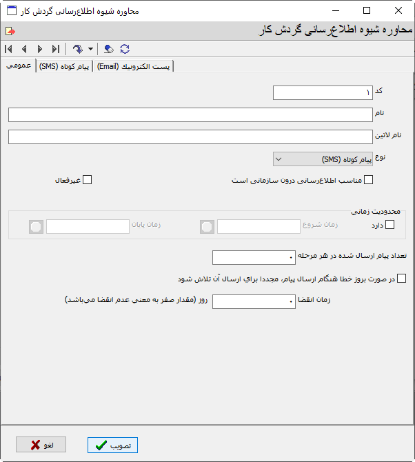 همانطور که ملاحظه می کنید تنظیمات شیوه اطلاع رسانی در سه برگه بنامهای «عمومی»، «پیام کوتاه» و «پست الکترونیک» انجام می شود. روش کار به این شکل است که در برگه عمومی نوع اطلاع رسانی (پیام کوتاه یا پست الکترونیک) و بقیه مشخصات عمومی تنظیم می شود و سپس بسته به نوع اطلاع رسانی، لازم است که در یکی از برگه های پیام کوتاه یا پست الکترونیک تنظیمات تکمیلی انجام شود.