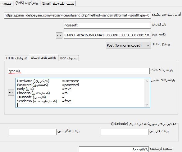 اگر دقت کنید متوجه خواهید شد که پارامتر type در فهرست پارامترهای متغیر وارد نشده است. علت آن این است که چون می خواهیم پیامکهای ارسالی از نوع معمولی (type=0) باشند لذا این پارامتر را در قسمت پارامترهای ثابت وارد کرده ایم. لازم به تاکید است این تنظیمات برای متد Get نیز قابل استفاده است اما مزیت عمده متد Post این است که داده های Url کد می شوند و قابل مشاهده نیستند لذا برای ارسال داده های حساس، مناسب تر است. البته متد Post مزایای دیگری نیز دارد که در مستندات پروتکل http موجود است.