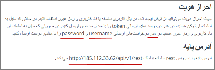 وب سرویس REST: در مستندات شرکت ایده پیام، آدرس سرویس دهنده و روش احراز هویت به شکل زیر اعلام شده است: