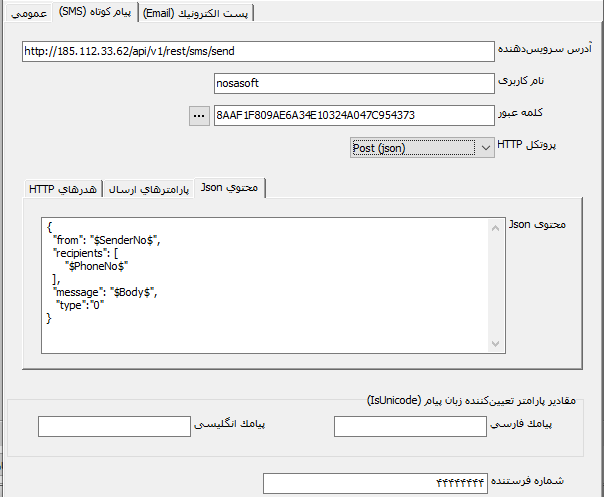 مقادیر پارامتر تعیین کننده زبان پیام (IsUnicode) : یکی از پارامترهای پیام، پارامتر IsUnicode است فارسی بودن پیام را تعیین می کند. در قسمت درج پارامترها و در مثال مشخص شد که یک سرویس دهنده از پارامتر isfarsi برای این کار استفاده می کند. حال در این قسمت باید مشخص کنیم که مقادیر این پارامتر چیست. یعنی این که کدام مقدار نشانگر فارسی و کدام مقدار نشانگر انگلیسی بودن این پارامتر است. برای مثال: