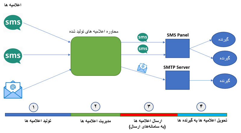یادآوری: در مطالب قبلی گفته شد، اطلاع رسانی بر اساس اعلامیه ها (پیامک و ایمیل) یک پروسه چهار مرحله ای دارد. این مراحل در شکل زیر نمایش داده شده است: