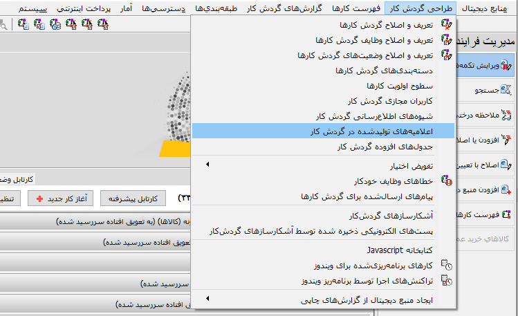 همانطور که قبلا هم گفته شد، پردازشهای مختلفی در محاوره اعلامیه های تولید شده انجام می شود که برای باز کردن این محاوره، باید مطابق شکل زیر، از منوی «طراحی گردش کار»، روی گزینه «اعلامیه های تولیدشده در گردش کار» کلیک کنید: