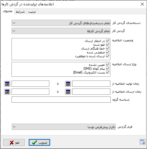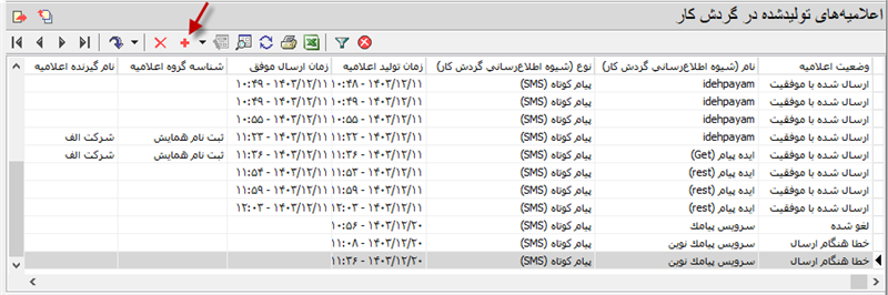 در این محاوره می توانید بر اساس ویژگیهای مختلف مثل نام گردش کار، وضعیت اعلامیه، نوع ارسال، زمان تولید و ... اعلامیه ها را به شکل محدود شده و منتخب به نمایش درآورید. در صورتی که تنظیمات پیش فرض را تغییر ندهید، تمام اعلامیه ها به شکل زیر روی صفحه باز می شود: