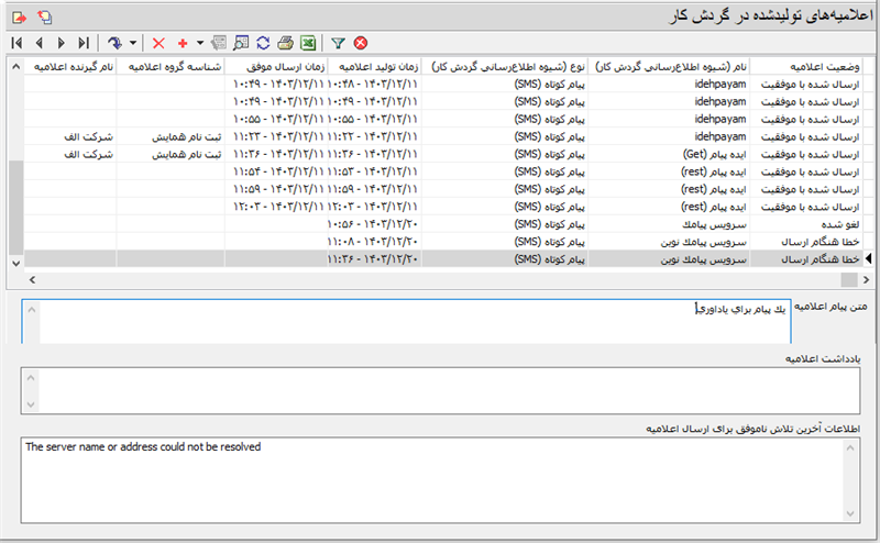 اطلاعات آخرین تلاش ناموفق برای ارسال اعلامیه: اگر ارسال اعلامیه با خطا روبرو شود، آنگاه پیغام خطا در این قسمت نمایش داده می شود. از آنجایی که بر اساس تنظیمات شیوه اطلاع رسانی، امکان سعی مجدد برای ارسال اعلامیه های در وضعیت خطا وجود دارد و در هر سعی مجدد ممکن است براساس تنظیمات شیوه های اطلاع رسانی، خطاهای مختلفی رخ بدهد، لذا در این ناحیه، پیغام خطای آخرین تلاش ناموفق برای ارسال اعلامیه به نمایش در می آید.