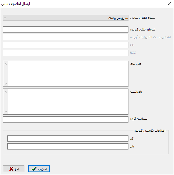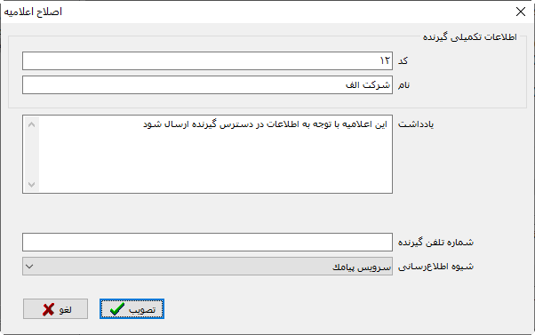 توجه کنید: فیلدهای «کد»، «نام» و «یادداشت» در این محاوره قابل ویرایش نیست و فقط جهت اطلاع و کمک به کاربر برای شناخت و تکمیل اطلاعات گیرنده اعلامیه است.