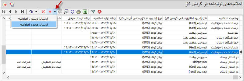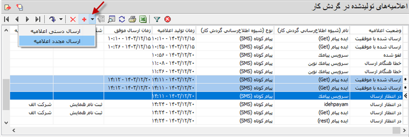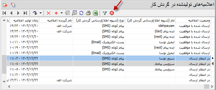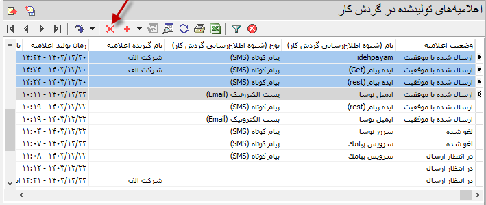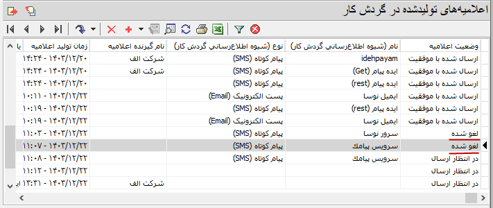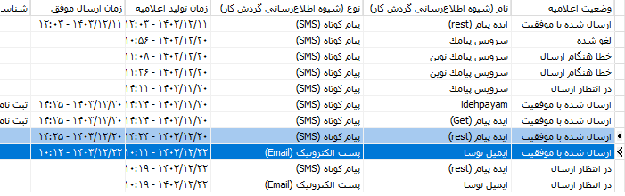 - ارسال شده با موفقیت: اعلامیه هایی که بدون خطا به سامانه های ارسال (پنل پیامک یا سرور پست الکترونیک) تحویل داده می شوند در این وضعیت قرار می گیرند.