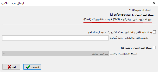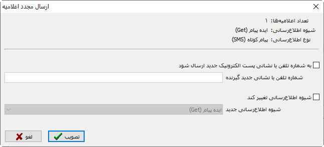 فرض کنید پس از ارسال اعلامیه متوجه شده ایم که شماره موبایل گیرنده تغییر کرده است، در این صورت می توانید گزینه ارسال به شماره تلفن/ آدرس پست الکترونیک را تیک بزنید و شماره یا نشانی جدید را وارد کنید.