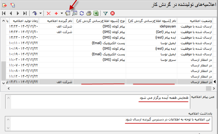 یکی از امکانات موجود در محاوره اعلامیه های تولید شده، امکان ارسال دستی اعلامیه هاست. به این منظور کافی است همانند شکل زیر، روی آیکون