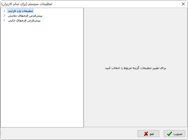 تنظیمات منو زیر مجموعه «تنظیمات وب فرایند» است که به شکل زیر، در محاوره تنظیمات سیستم (برای تمام کاربران) قرار گرفته است: