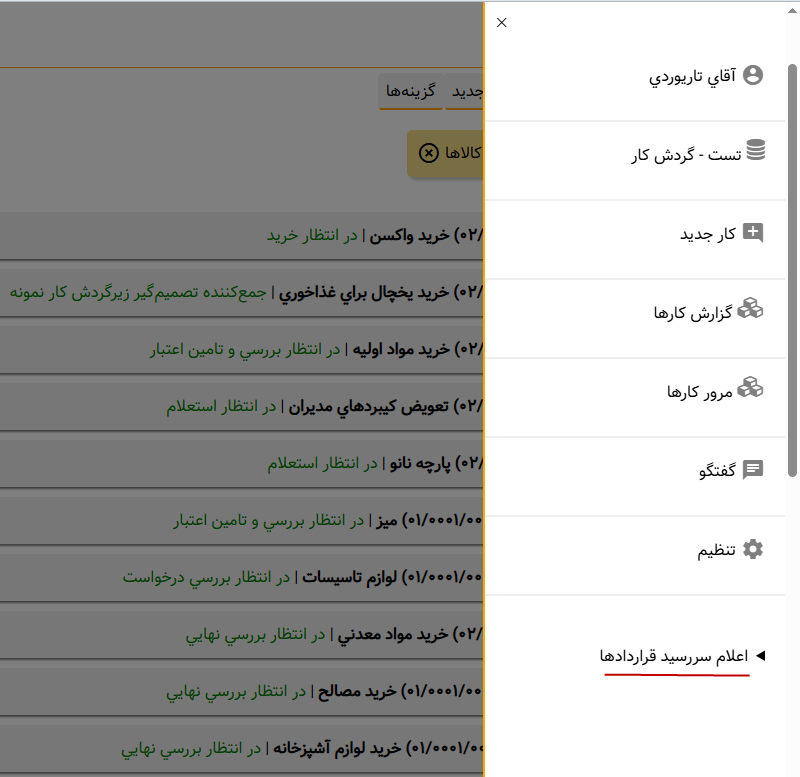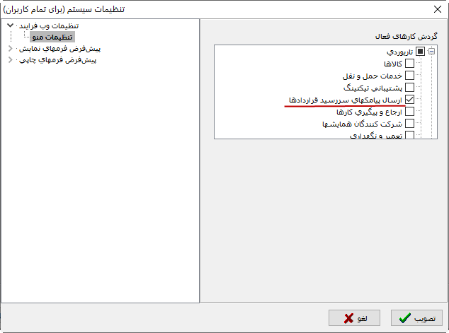 ملاحظه می کنید که با کلیک روی تنظیمات منو، گردش کارهای فعال، در سمت راست این محاوره نمایش داده می شود. حال باید طراح سیستم، گردش کارهای مورد نظر خود را از این لیست انتخاب نماید. در این مثال، گردش کار «ارسال پیامک های سررسید قراردادها» انتخاب شده است. به این ترتیب کارهای موجود در این گردش کار به شکل زیر به منوی کلاینت وب منتقل می شود: