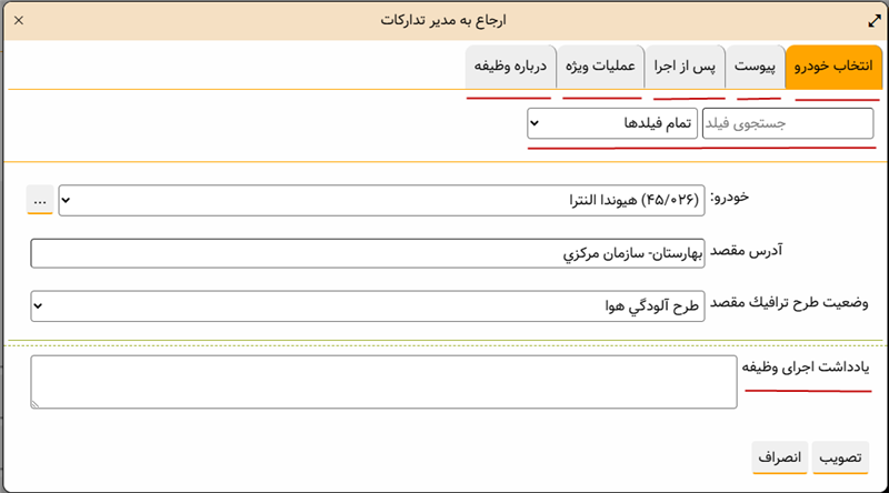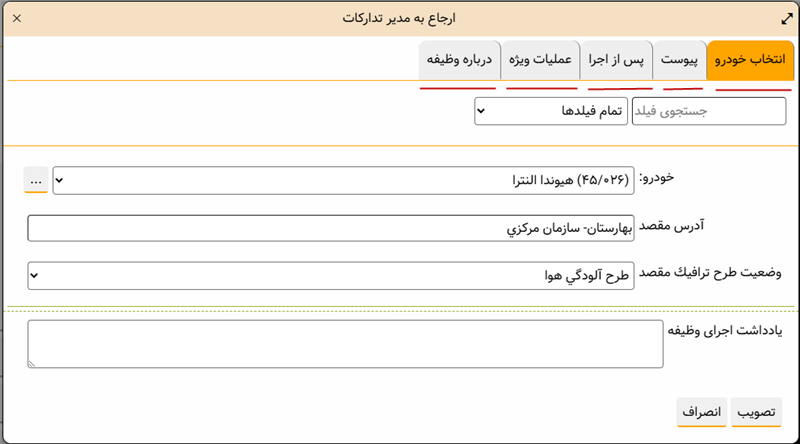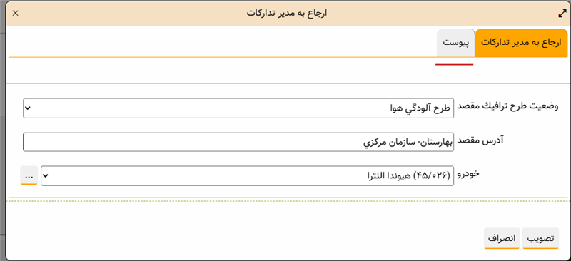 در این مثال در گردش کار مدیریت حمل و نقل، کاربر روی وظیفه «ارجاع به مدیر تدارکات» کلیک کرده و محاوره انجام وظیفه به شکل بالا روی صفحه باز شده است.