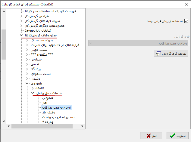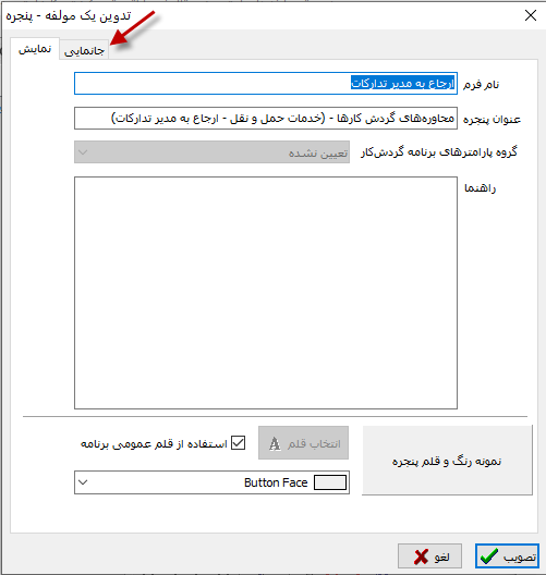 برای این کار باید در کلاینت ویندوز، مطابق شکل زیر محاوره تنظیمات فرم خاص مرتبط با وظیفه «ارجاع به مدیر تدارکات» را باز کنید: