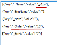 - _Name (نام دسته بندی): در اینجا نام فارسی دسته بندی به فرمت Escaped Unicode قرار می گیرد که در حالت عادی خوانا نیست اما به همین شکل قابل انتقال و پردازش است. البته به ترتیبی که در مراحل بعد شرح داده می شود می توانیم برای تست، این فرمت را بصورت فارسی خوانا تبدیل کنیم .