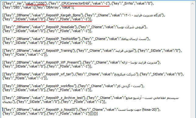 ملاحظه می کنید که در این سرور، نسخه 15.50 سیستم مدیریت فرایندها نصب شده است و ماژول CPUConnector راه اندازی شده است. ضمنا ویژگی گروه پایگاه (_Group)در این خروجی وجود ندارد و ویژگیهای _StDate و _Fdate مقادیر ثابت دارند.