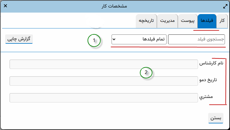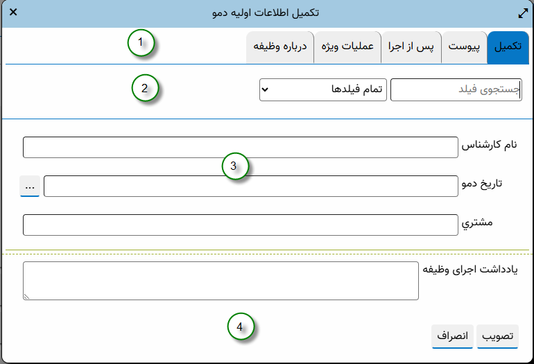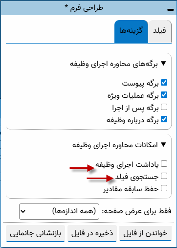 در این بخش، می توانید نمایش ناحیه های «یادداشت اجرای وظیفه» و «جستجوی فیلد» را مدیریت کنید. برای مثال اگر اصولا از یادداشت اجرای وظیفه استفاده نمی کنید بهتر است این برگه را غیرفعال کنید، حتی برای خلوت تر شدن محاوره انجام وظیفه می توانید ناحیه «جستجوی فیلد» را نیز غیر فعال کنید (مانند مثال زیر):