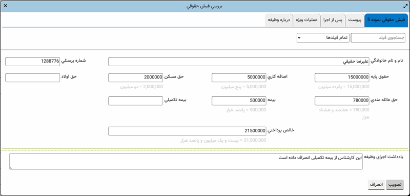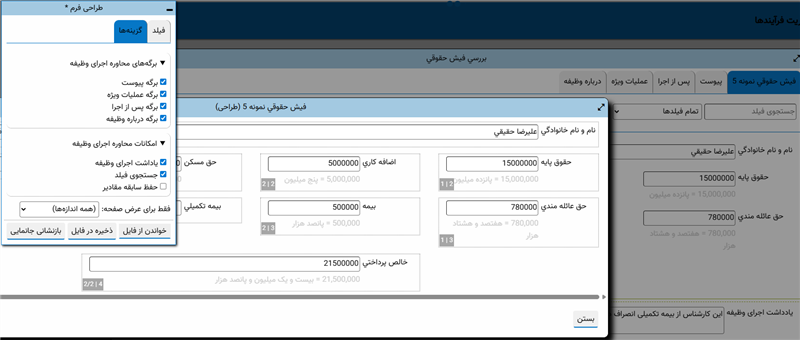 برای تنظیمات فرمهای نمایشی کافی است ابتدا فرم مورد نظر خود را روی صفحه باز کنید. برای مثال فرض کنید می خواهیم تنظیمات فرم انجام وظیفه زیر (بررسی فیش حقوقی) را ویرایش کنیم: