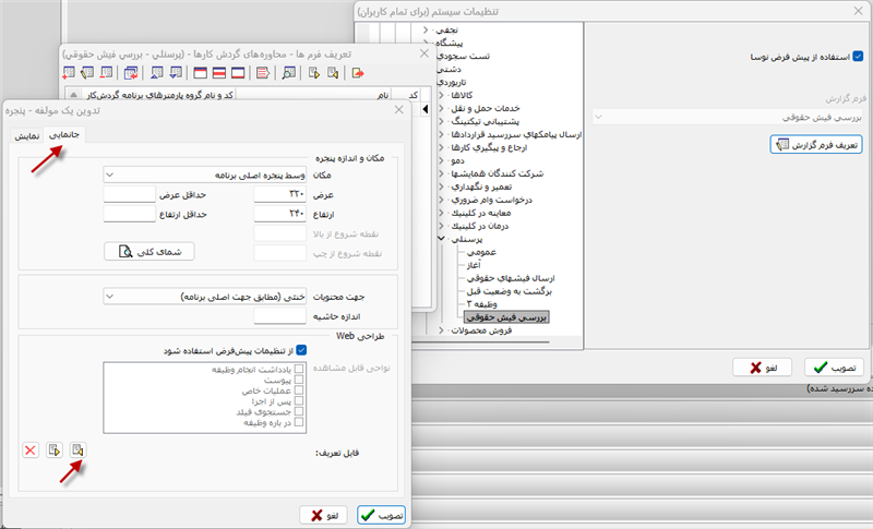 برای دائمی شدن تغییرات باید فایل json را در محاوره اصلاح فرم نمایشی مورد نظر در کلاینت ویندوز بازیابی کنید. برای این کار، محاوره تعریف فرمهای عمومی گزارش در کلاینت ویندوز را باز می کنیم و سپس همانند شکل زیر روی آیکون «اصلاح فرم تحت مکان نما» کلیک می کنیم و در محاوره «تدوین یک مولفه»، برگه «جانمایی» را باز می کنیم: