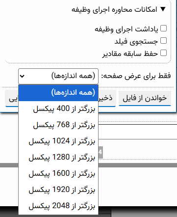 برای مثال اگر فرم را چهار ستونی طراحی کرده اید قطعا برای عرضهای کوچک مثل صفحه موبایل(حدود 400 پیکسل) مناسب نیست و باید عرضهای بیشتر از 1200 پیکسل (سایز دسکتاپ) را انتخاب کنید. اندازه هایی که برای تنظیم وجود دارند به شکل زیر است: