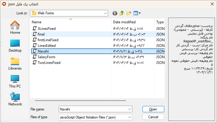و در نهایت کافی است با کلیک روی تکمهOpen فراخوانی فایل انجام گردد. به این ترتیب، مشخصات ذخیره شده در فایل json بطور دائم در این فرم ذخیره می شود و از این پس نمایش جانمایی فیلدها در کلاینت وب مطابق با مشخصات درج شده در فایل json خواهد بود.